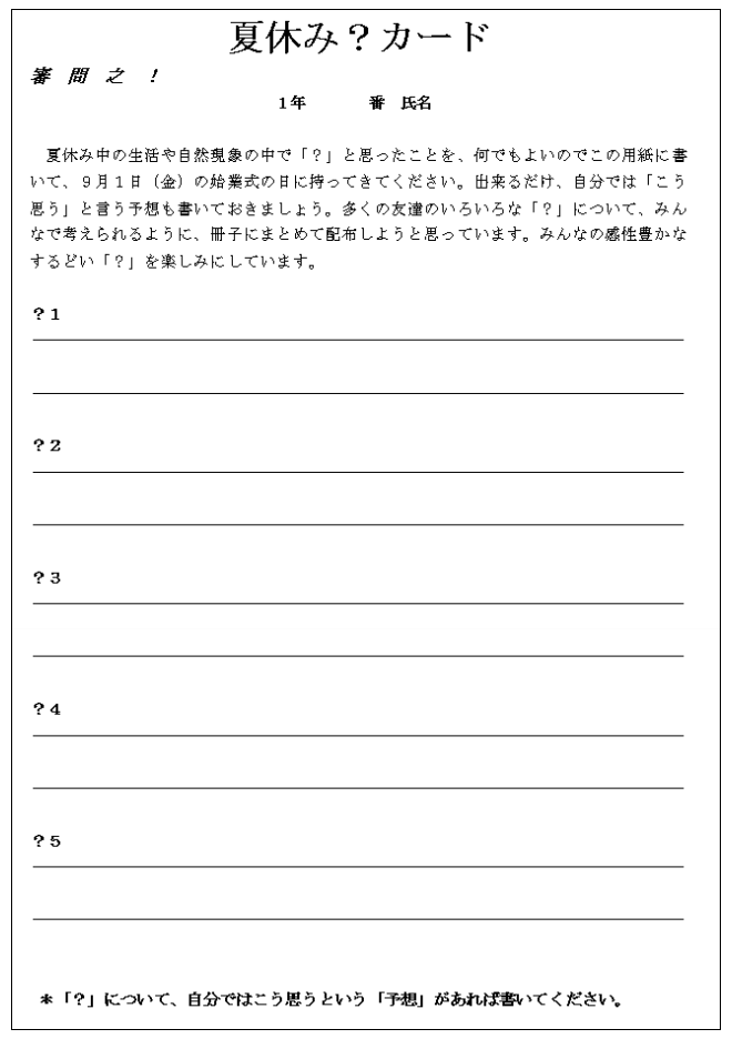日常生活の中で大人にとっても子供にとっても疑問ばかり,分からないことばかりなのに,みんな知ったつもりで生活している。そこで,夏季休業・冬季休業などの長期休業期間を中心に,1学年は自然現象や生活の中で「?」と思ったことを5項目を目安に,2学年は新聞を読んでいて「?」と思ったことで3項目程度(休業中の課題の一つにしている)記録して提出させ,みんなの「?」を集めて「?集」の冊子を作成し,それを元に昼食後の時間に校長と順番に懇談の時間を持ち,「世間話の出来る生徒」の育成を目指している。