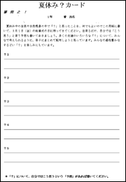 また,この用紙を縮小コピーして欠席の生徒に届けることによって,その日の学校での学習状況を知らせることが出来,欠席生徒と学校との心理的距離を縮めることが出来るのではないかと考えている。基礎学力アップにもつながることを期待している。 |