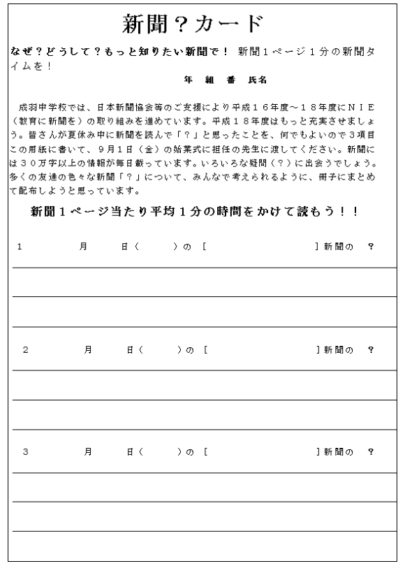 さいわいな事に,本校では平成16年度からNIEの取り組みを始めており,NIE事務局の特段の配慮により平成18年度で3年目を迎えている。このNIEを充実させることも,重要な教育活動の施策の一つとして,全職員で工夫しながら展開している。