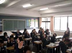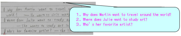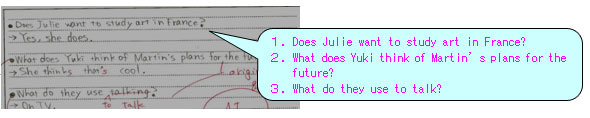 まず,教科書内容理解後,生徒自身が,本文に関する質問文とその答えをワークシートに書き込む。ワークシートへの書き込みを終了後,自分の作った質問文をクラスで発表する。その質問に対し,他のクラスメイトは,答えを考え発表する。質問をクラスに投げかける際は,出来るだけ教科書の流れにそった順番で質問できるように,他のクラスメイトの質問をよく聞いていなければならない。