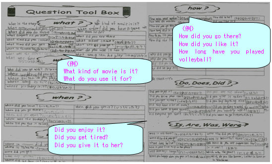 上のような質問をするために,生徒は, Question Tool Boxとして,自分が使えそうな質問をワークシートに書きためる。以下の[例]は2年生のA生が書きためたQuestion Tool Boxである。