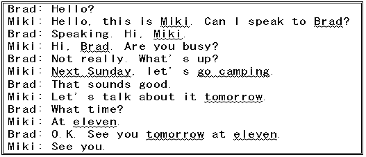 以下に,基本文の一部[例1]とそれを学習した後のA生とH生の作った対話文[例2]をのせる。