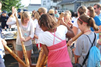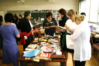 一中のお母さん達は家で眠っている引き出物の和食器や不要になった帯や着物,浴衣などを持ち寄り,オーチャードスクールのお母さん達はケーキミックス粉,コーンホールダー,アクセサリー,石けんなどを持ち寄って,バザーでのショッピングを楽しんだ。商品には値札が付けられないかわりに募金箱が置かれた。 「プロジェクトX」というNHKの番組で紹介されたルダシングワ真美さんにもバザー会場にお越し頂いた。彼女は地雷被害者のためにルワンダに義足工房を立ち上げて,義足作りやその制作指導に貢献されている。募金箱に投じられた金額はドル紙幣と日本円併せて61,415円,そのすべてを彼女が活動するルワンダにおける障害者支援活動に寄付した。 |