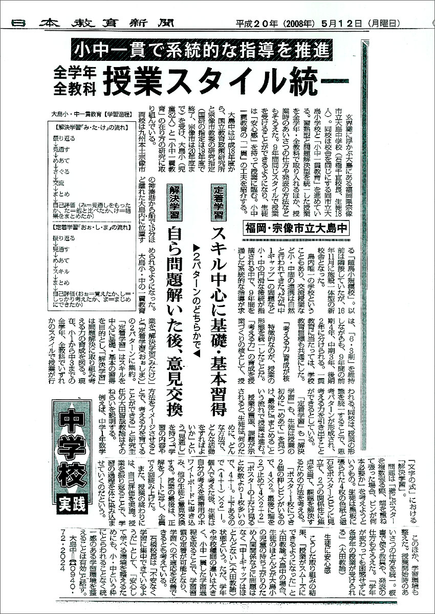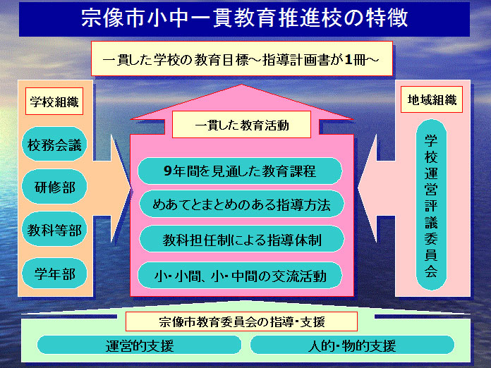 宗像市の大島中学校区,日の里中学校区の2つの小中一貫教育の推進校では,これまで別々の教育目標のもと,小・小間,小・中間で全く違う取組が行われていたのを,同じ教育目標にして取組を始めました。