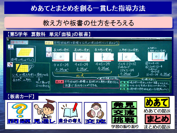 また,小学校の算数科では,1単位時間の導入,展開,終末段階における学習活動や教師の手だての在り方,「めあて」の条件(下記参照)を明記した指導方法モデルを提示し,それぞれの学校の校内研修の日常化に役立てるようにしました。