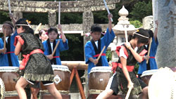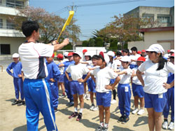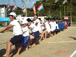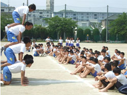 指導方法や指導体制を一貫させるだけでなく,日の里中学校区や大島中学校区では,学校行事などでも小・中学校間の児童生徒の交流を進めています。日の里中学校区では,中学校生徒による小学校児童の組体操指導(写真1),歓迎遠足,クリーン作戦や授業交流活動,6年生の修学旅行,5年生の集団宿泊学習を行っています。大島中学校区では,もずくとり,大島山笠(写真2)櫓漕ぎ大会,運動会(写真3)などを行っています。