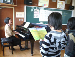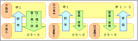 大島地区では,大島中学校の数学,音楽,社会,体育の教員が,大島小学校の前期・中期の児童を中心に各教科の授業を行っています。