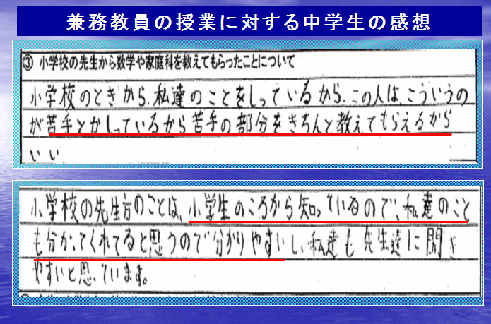 右は,日の里中学校で小学校の兼務教員による授業を受けた生徒の感想です。「小学生のときから私たちのことを知っているから,苦手の部分をきちんと教えてもらえる」という感想に見られるように,教師の専門的な指導により,中学校生活での安心感を与えているのがおわかりいただけると思います。