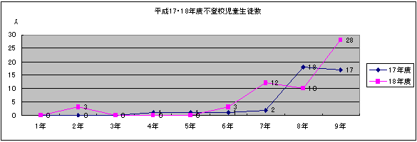 宗像市は不登校の発生率が全国的に見ても少ない自治体ですが,不登校が発生する時期は,平成17年・18年の2ヵ年ともに中1(7年)・中2(8年)に急激に高まるという傾向を示しています。