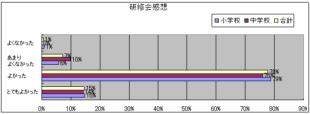 さらに,昨年度の小中一貫教育推進校中間発表会で実施した市内小・中学校教職員のアンケート結果からもわかるように,「よかった」「とてもよかった」が約90%を占めることから,本市の小中一貫教育の発表内容に対して,肯定的であることがわかります。