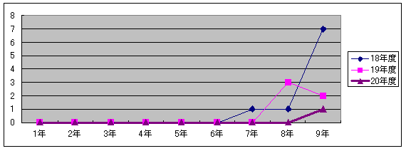 上のグラフは,日の里・大島中学校区における平成18年度〜20年度の不登校児童生徒数の変容です。このグラフを見ると,18年度9月期は9名であったのに対し,20年度9月期は1名へと減少していることがわかります。特に,7年生(中学1年生)の不登校数は0名になっています。