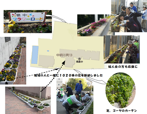 北側の植え込みを『徳中フラワーロード』とし,正面玄関のプランター,鉢植え等に,オーケストラ部を中心に植える。 |