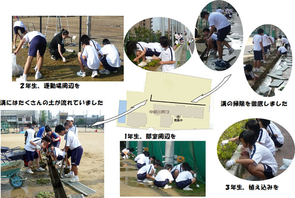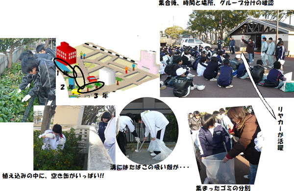 1年生を中心に,生徒,保護者,教職員がゴミの状況を調べながら校区内を清掃し,環境美化への意識を高めると共に,地域を愛する心を育てる。(3月の予定) |