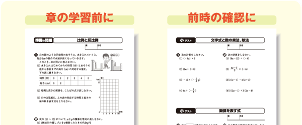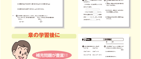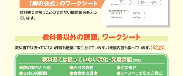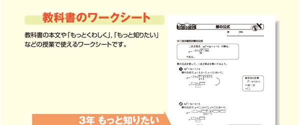 コピー資料集では,各章の準備の問題や小テスト,中間・期末テスト,教科書のワークシートなどを,コピーしてそのまま授業で使える形で用意しています。さらに,今回は,教科書の補充課題「もっとくわしく」,深化・発展課題「もっと知りたい」のワークシートや,教科書以外のあらたな補充,深化・発展課題も取り上げています。これらの資料を使うと,補充的,発展的な学習を少人数指導で進めることもできます。
