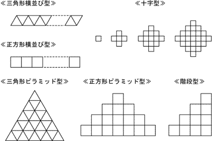 | * | このほかにも,《六角形ハチの巣型》《煉瓦積み型》《不連続型》など,いろいろ出された。 |