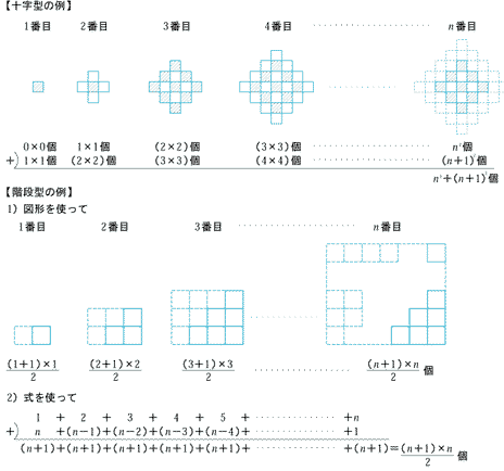 | * | 以上が模様作りとして出されたものである。問題作りでは, ア.マッチの全体の本数 イ.三角形・正方形の面の数 ウ.周の長さ エ.頂点の数 オ.n番目の本数の式,などが出され,本時では特に,イに目を向けさせて問題を解かせた。 |