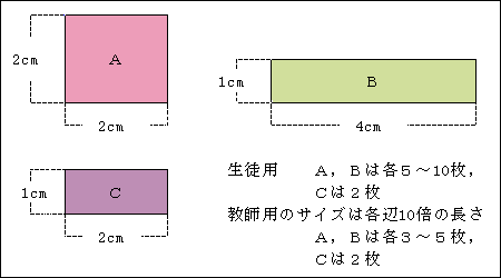本稿では十分表現できているとはいえないが,天びんに比べて,大きい模型が使える,切り取り,重ねなどの手法が簡単に行える等々,作業そのものは生徒にとって視覚的にとらえやすかったようである。直観的にとらえるという点では,「天びん」も「面積図」も大きな違いはないと思うが,4つの性質を個別に導くという点では,順不同で扱えるため,「面積図」の方が面白いという感想を持った。