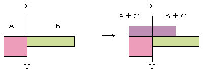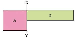 | 対称軸の左右に同じ図形(合同な図形:面積C)をおく。 ↓ 直線XYの左側の面積A+Cと右側の面積B+Cは等しい。 |