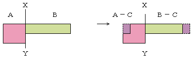 | | 2)両辺から同じものをひく。 | 対称軸の左右から同じ図形(合同な図形:面積C)を取り去ること ↓ 直線XYの左側の面積A−Cと右側の面積B−Cは等しい。 |