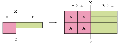 | | よって,「A=Bならば,A−C=B−C」 3)両辺に同じものをかける。 | <等式の性質2> 対称軸の左右に,それぞれ同じ図形を置くこと ↓ 直線XYの左側の面積A×4と右側の面積B×4は等しい (枚数の組み合わせを3〜5の範囲でいろいろ試してもよい)。 |