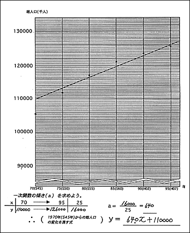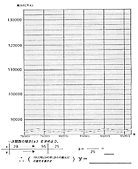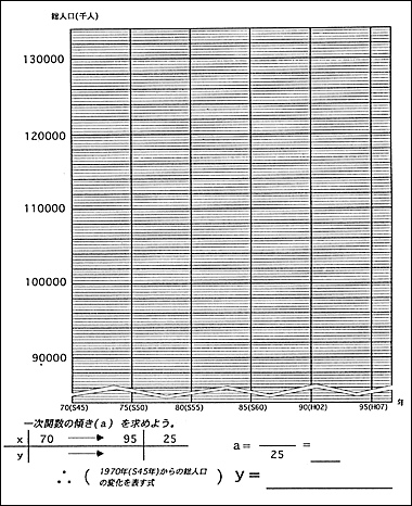 | ・ | グラフを折れ線・直線・曲線にする生徒がいると思われるが,生徒の自由な発想で考えさせたい。いろいろな考え方で1995年以降の人口を推測させたい。