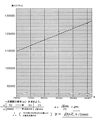 | ・ | およそ,y=640x+110000ぐらいの式が導けるとよいが,後に個々の生徒の導いた式を考察することが大切なので,必要以上に式を提示することはないと思われる。 |