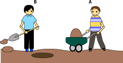 | 積むぞ!掘るぞ!ゲーム Aさんは土を積み上げ,Bさんは土を掘ります。Aさんから交互にサイコロを振り,出た目の回数だけ土を積んだり,土を掘ったりします。お互いに4回ずつサイコロを振った時点でゲームは終了です。山ができていればAさんの,土を掘って穴があればBさんの勝ちとなります。勝者は地面からの距離を1m=1点として,得点を獲得できるものとします。山も穴もない場合は引き分けとし,お互いに0点とします。 |