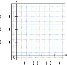 | (2) | x,yの関係をx軸,y軸の目盛りの取り方に注意して,グラフに表してみましょう。 ( )に目盛りの数値をいれましょう。 ![]() |