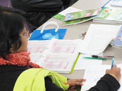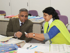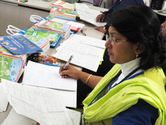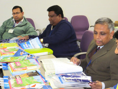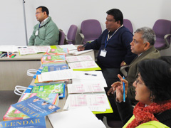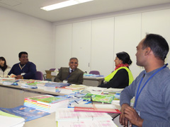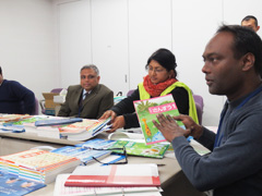 続いて教科書制作について意見交換をしました。日本では文科省が定める学習指導要領に基づいて教科書が作られることや教科書検定制度があることに関心が高く,次々に質問の声があがります。バングラデシュでは初等教育で9教科あり,国語・算数・英語・理科・環境・道徳・体育・音楽・図工を指導するとのことでした。日本の教科書内容や系統表,教科書に付属している教具に興味津々な様子です。