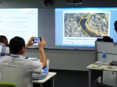 続いて教師用指導書やデジタル教科書をご紹介しました。特にデジタル教科書には関心が高かったようで,その有用性や操作方法などを周りの方とお話しされたり,写真に収めたりされていました。
