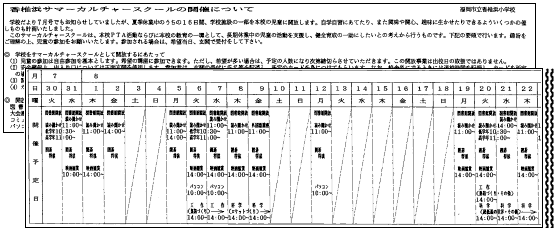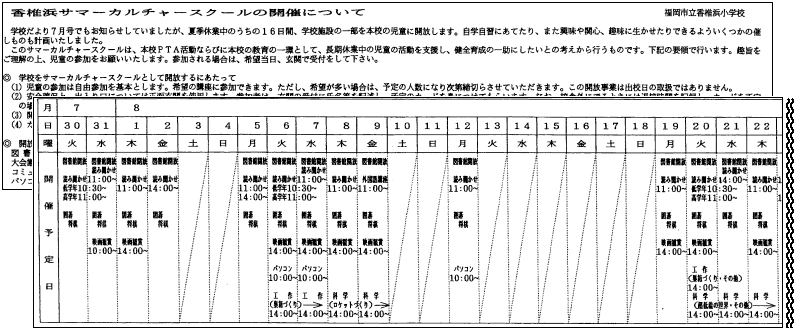 | ・ | 「サマー・カルチャー・スクール」は,PTA活動及び本校の教育の一環として長期休業期間中の児童の活動を支援し,健全育成を図ることを目的とする。