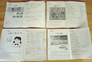 1組の平行線をひいたワークシートを用意して書かせた。平行四辺形を長方形の紙を重ねてかく方法はわかりやすかった。方眼にかく際は,ます目を数えて直線の傾きを決めることを思い出させた。 |
