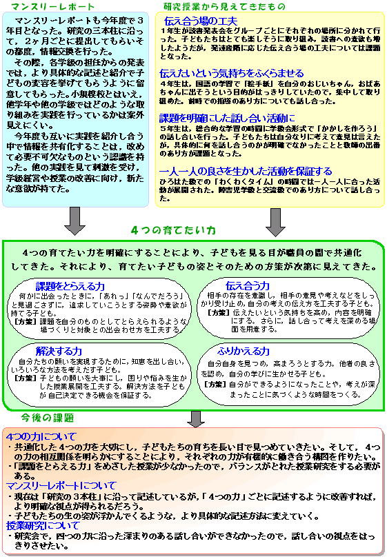 「子ども一人ひとりの主体的な学習活動を図る」ことを私たちの重点課題として4年。今の自分をしっかり見つめ,次の自分に向けて課題を持って真剣に取り組むことのできる子への育ちを描いて研究を継続してきている。