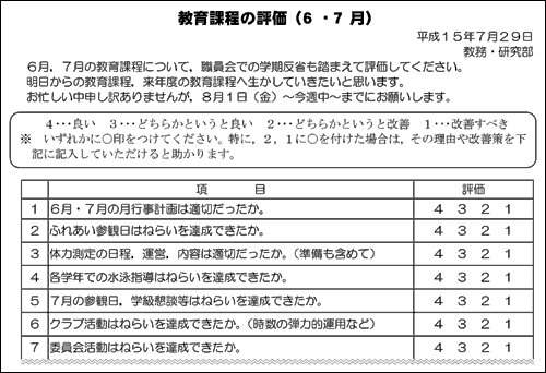 2ヶ月ごとに,教育活動全般にわたって,全職員が4段階評定と所見で評価する。 |