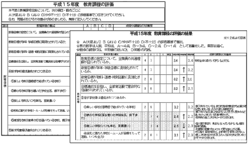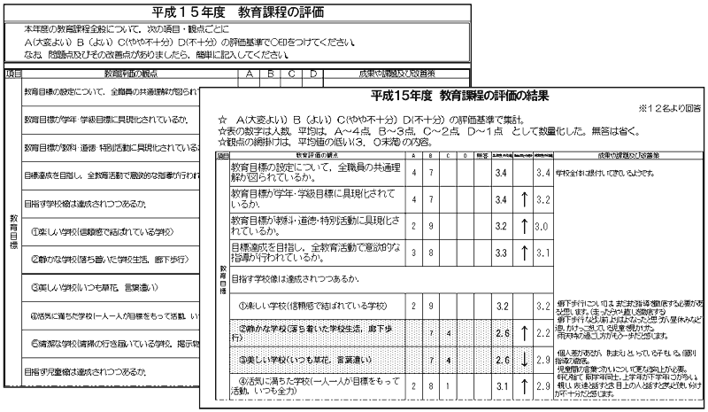 年度末の評価を「学校の教育目標」「教育計画」「週時程」「各教科」等15の項目に分類し,それぞれ具体的な内容で評価を実施した。また,結果については,数値化して,前年度との比較,検証を行い,課題が明らかになるようにした。