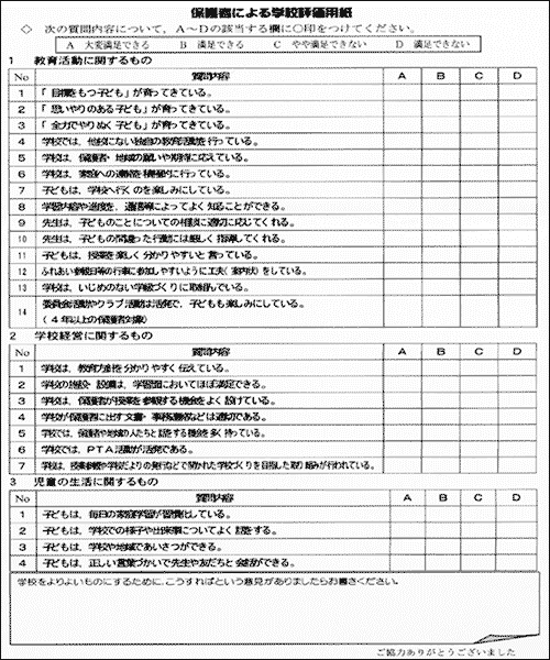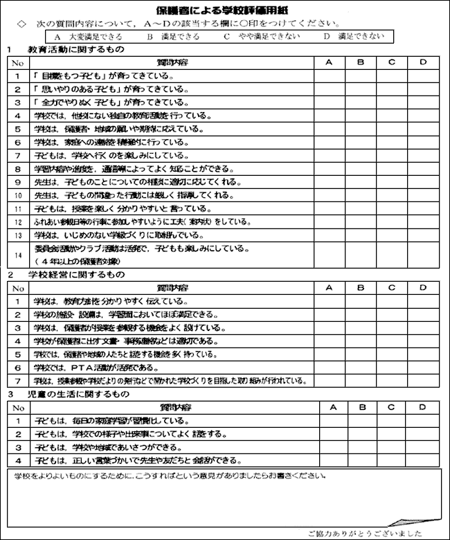 次年度の教育課程編成に向けて,保護者の意見を集約するため,右のような評価を行った。特に,保護者が関わる行事,参観日,家庭訪問について意見を求めた。