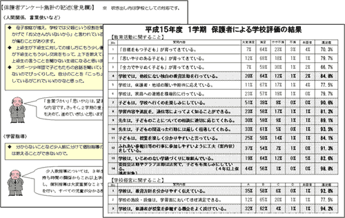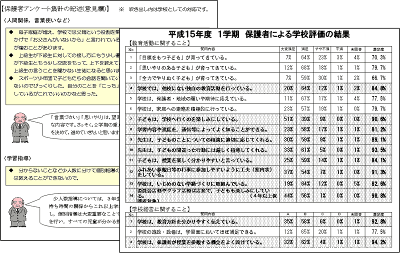 保護者による評価の結果については,集計結果を数値化したり,意見に対する学校としての対応を明確に示したりして,常にその情報公開と学校としての教育方針について伝えることにした。