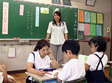 「フットワーク・ネットワーク・チームワーク」を合言葉に学校職員をはじめ,学生や教職を目指す方等の教育ボランティアやゲストティーチャーなど,子どもを取り巻くすべての大人が一丸となって日々の教育活動に取り組んでいる。そこでは,チーム医療(※)の考えを取り入れた協力体制が築かれている。その他に,各職員のコンピュータをつないだ校内LANシステムを活用し,確実な情報の共有化を図っている。