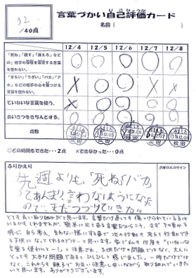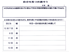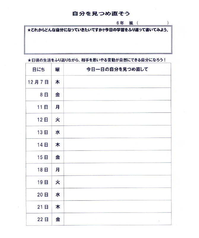自己点検カード「自分を見つめ直そう」を作成し,1週間後に結果について話し合うことを知らせる。 |