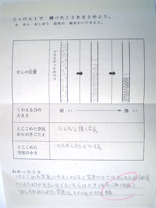 空気は,身の回りにありながら,色も形もにおいもなく,重さやかさを感じることもない存在である。そこで,実験結果をまとめる時には,言葉だけでなく絵を使って表すようにさせた。目に見えない空気の存在を図で表すことによりイメージ豊かにとらえることができた。