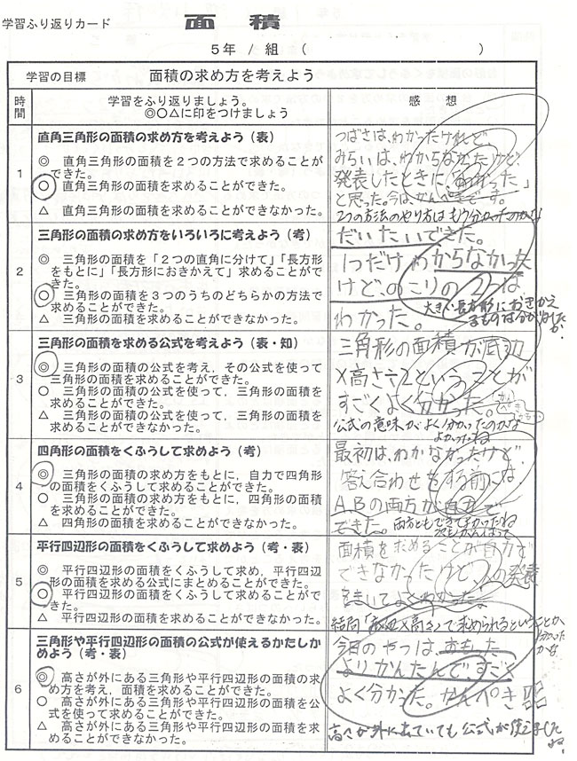 また自己評価表の感想欄に「何が分かって,何が分からなかったか」を記録させたので,その後の授業や個別指導に有効に生かすことができた。例えば,三角形の面積を3通りのやり方で求める授業では,多数の児童がどれかの方法で求めることができる「○」と自己評価した。そこで,次の授業では,もう一度3通りの求め方について丁寧に復習し定着をはかった。さらに「△」と自己評価をした児童には,放課後などに個別指導を行った。こうして自己評価表を基に,個に応じた指導を継続することで,児童の理解度を深めることができた。また,「先生は自分のことをちゃんと見てくれている」という安心感を与えることにつながり,教師と児童との信頼関係を深め,よりきめ細やかな指導を実現するのにも大変役立った。