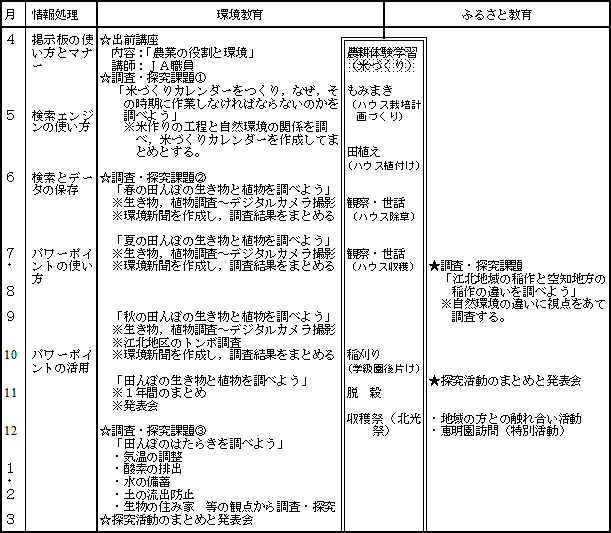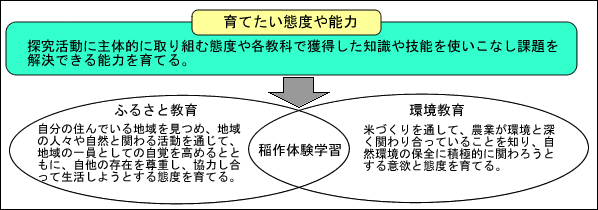 本校の総合的な学習の時間は,主として「環境教育」と「ふるさと教育」によって構成されています。この2つのジャンルを結ぶものが稲作体験です。稲作体験を通して,環境への関心を高め,身近な課題を持たせ,探究活動に取り組ませていくことや自分たちの住んでいる地域の自然や産業,歴史などにに目を向けさせ,ふるさとをより深く理解させることを目指しています。