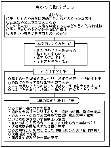 本校では,子どもたちにはぐくみたい心やそのための具体的方策を明確にした「豊かな心醸成プラン」を策定し,その実践に努めています。中でも,土に触れ,植物に触れ感動を覚えたり,稲の成長を見守り,収穫の喜びを体感できる「稲作体験」は,命を大切にする心やふるさとを愛する心の育成に大きな役割を果たしています。田んぼの中には,ゲンゴロウやヒルなど,子どもたちが予想もしていなかった生き物が住んでいます。時には,ドジョウを発見できることもあります。遠くから見ると土色の無機質な田んぼに多くの生き物が住んでいることを発見し,様々な命を育んでいる田んぼの役割に気付いたとき,子どもたちは,命の尊さを実感します。また,稲作体験に関わった多くの人たちとの触れ合いを通して,自分たちを支えてくれる人たちの存在を実感し,自分たちの住む地域に愛着を感じるとともに,感謝の心がはぐくまれていきます。そのような体験活動がもつ機能を十分生かしながら,豊かな心の育成に取り組んでいます。