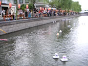 備前堀に伝わる伝統と歴史のある灯ろう流しを,地域に残る文化的な行事の体験活動として,親子参加で行った。左はプロジェクト委員の指導による灯ろうづくりの説明会,右は灯ろうを流しているところである。 |