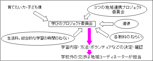 学びのプロジェクト委員会とのつながりにおいては,3つの地域プロジェクト委員会の意見等(子どもたちに学ばせたい教材など)とのすりあわせの中で学習活動をつくり出している。 |