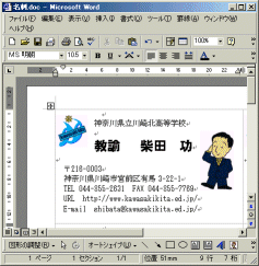 ワープロソフトと画像処理ソフトを使ってオリジナル名刺を作成します。名刺カードの小さなスペースにお気に入りのフォントで自分の名前や肩書きを入れ、マウスで描いた似顔絵を挿入すると生徒一人ひとりの個性があふれ出る作品ができあがります。完成後は友だちと名刺交換が始まり、コミュニケーション作りにも役立っているようです。■ DATA
