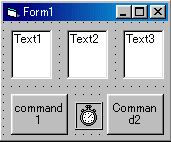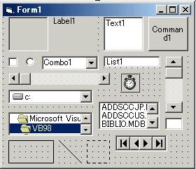 具体的な指導案はhttp://www.johoka.net/slot/vbslot.htmに掲載プログラミング言語はなんでも構いません。私の場合、今までにVisualBasic6.0、JavaScript、N88BASICの3つの言語でスロットマシーン作りの授業を行いましたがアルゴリズムは同じですのでどの言語でも問題ありませんでした。生徒に配布するものとしてその言語の主なコマンドが書かれたプリントと、発展的なことをする生徒向けに各PCに1冊ずつ市販のテキストを用意します。■ 導入 〜オブジェクトを置いてみよう〜■ 演習1 〜ここを押すと「こんにちは!」〜まずは、プログラミング開発環境を簡単に説明します。VisualBasicの場合は表示されるウィンドウやツールバーがたくさんあるので画面の説明を簡単にしておきます。その後、フォームにオブジェクトを置く練習をします(右図)。クリック&ドラッグで何個ものオブジェクトをフォームの上に「子どものブロックおもちゃ」感覚で自由にレイアウトしていきます。生徒たちはこの段階ですでに楽しんでいました。