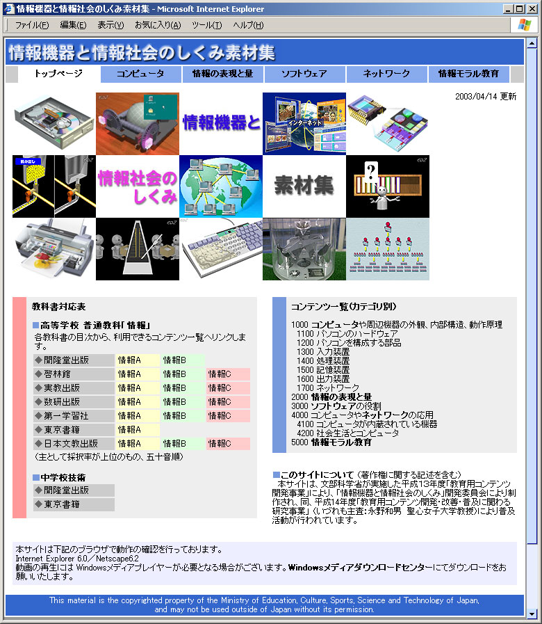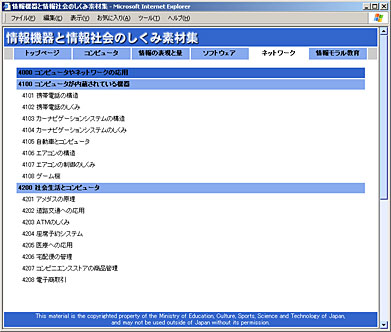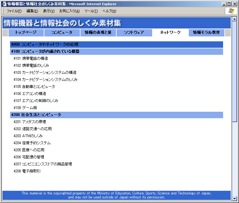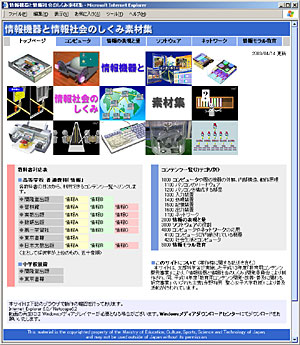 | 本校は、情報免許取得者3名が全員数学の教員と言うこともあってか、比較的科学的理解の重みが高い情報Bを1年生の必修科目として設定した。教員が授業をやりやすいということが重視されたわけであるが、当然、授業の中では、情報活用の実践力や社会に参画する態度も育成しなければならない。なかでも、社会に参画する態度に関してはマナーやモラルに加え、変化が激しい高度情報化社会についても教員側である程度、基礎知識を身につけていなければ魅力的な授業は展開できないと考えられた。ただ、正直なところ、私自身が現在の情報社会システムに精通しているとはいえず、この分野(啓林館教科書「情報B」第5章)の授業展開に不安を感じていた。 そこで、Web上にある「情報機器と情報社会のしくみ素材集」を利用した授業展開を考え実施した。このサイトは、文部科学省が実施した平成13年度「教育用コンテンツ開発事業」により、「情報機器と情報社会のしくみ」開発委員会が制作し、平成14年度「教育用コンテンツ開発・改善・普及に関わる研究事業」 (いずれも主査:永野和男 聖心女子大学教授)として普及活動が行われている。