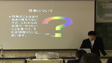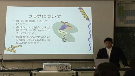 「情報A」における学習を基礎に、自己紹介(以下、発表1と略)をプレゼンテーションソフトウエアを用いて行わせる。その発表を振り返り自己評価を行うと共に、クラスの友だちの発表も評価(相互評価)する。それらの評価を比較・分析し、自らの課題を見つけ、プレゼンテーションの改善を行い、発表(以下、発表2と略)し、再び自己評価及び相互評価を行う授業構成となっている。2枚の写真は、生徒によるプレゼンテーションの一場面である。