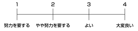 表2に示された10の評価項目には、図1のような4段階の評定尺度を与え、そのどれに該当するか回答させた。授業評価の際には、それぞれの評定尺度に与えられた数値に分析を加えた。